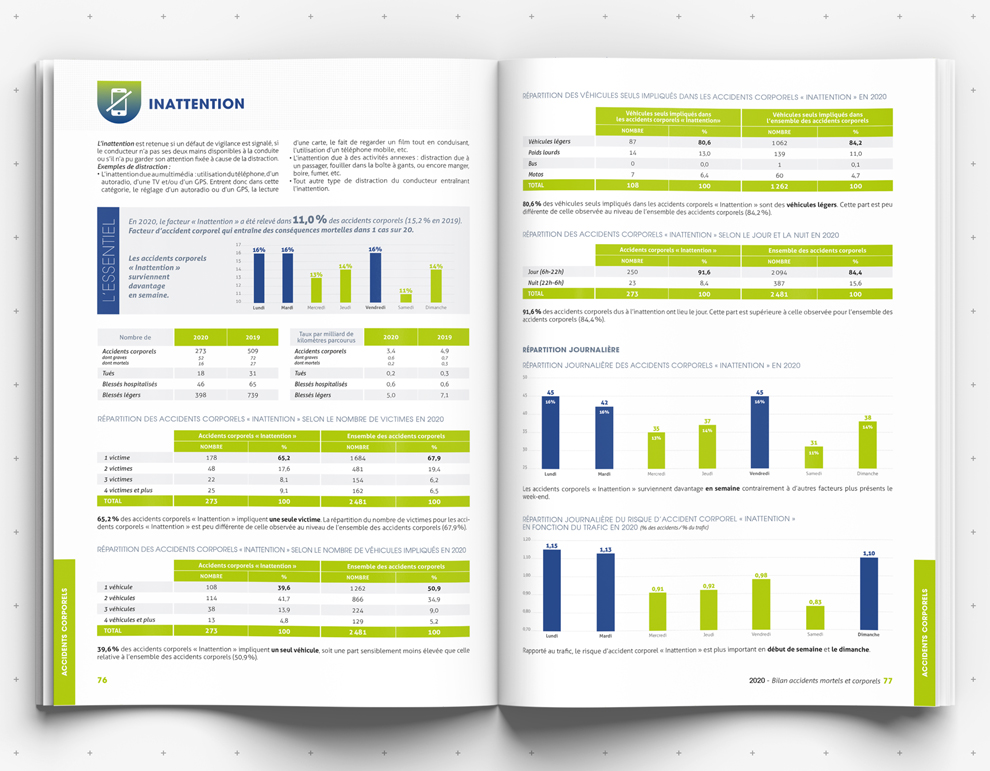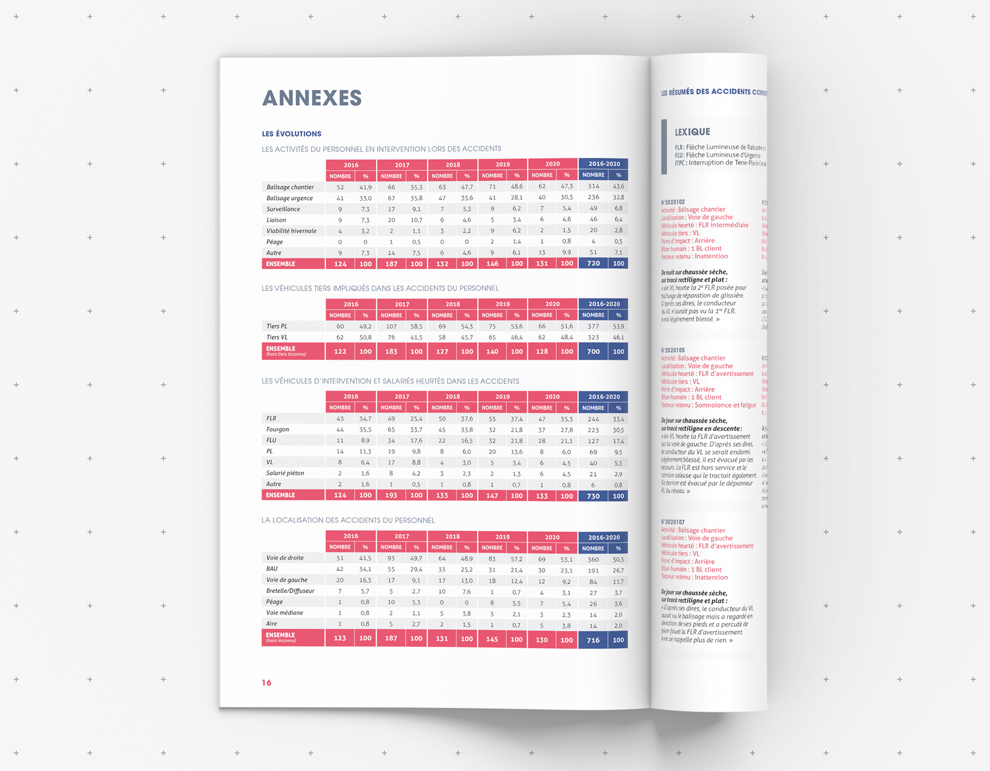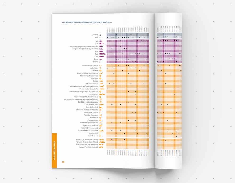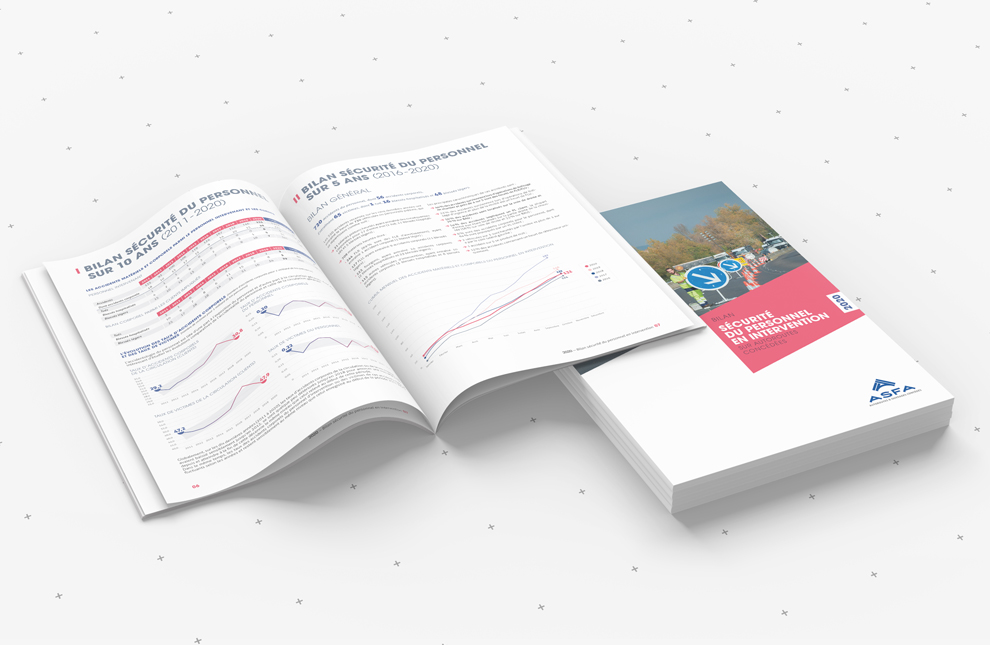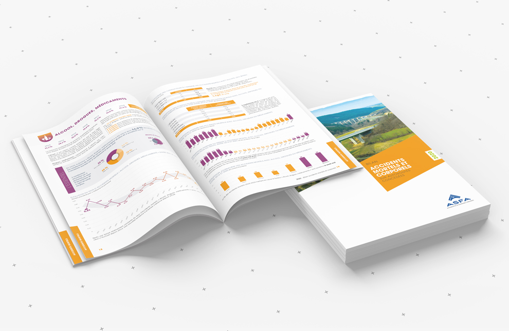 Réalisation pour l’ASFA (collective des sociétés d’autoroutes françaises) de plusieurs publications qui dressent le bilan annuel des accidents mortels sur autoroutes. La mission : clarifier et rendre plus facile la lecture de contenus analytiques souvent denses et qui ont trait à une “réalité difficile”.